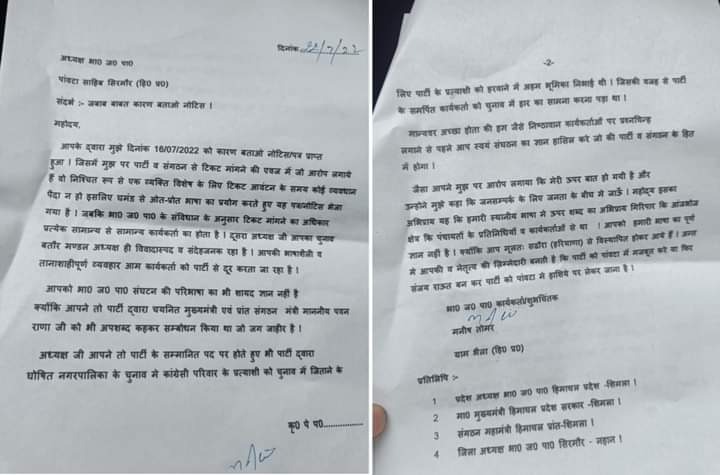 शुक्रवार को जिसका जबाब मनीष तोमर ने पत्र के माध्यम से अध्यक्ष भाजपा पांवटा साहिब को भेजा। जिसमें उन्होनें कहा कि मुझे पार्टी व संगठन से टिकट मांगने की एवज में जो आरोप लगाए हैं वो निश्चित रूप से एक व्यक्ति विशेष के लिए टिकट आवंटन के समय कोई व्यवधान पैदा न हो इसलिए उन्होनें घमंड से ओत-प्रोत भाषा का प्रयोग करते हुए यह पत्र नोटिस भेजा।
